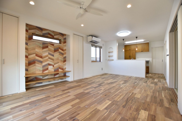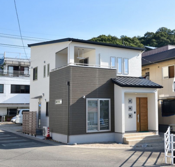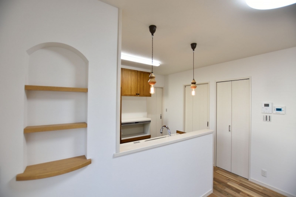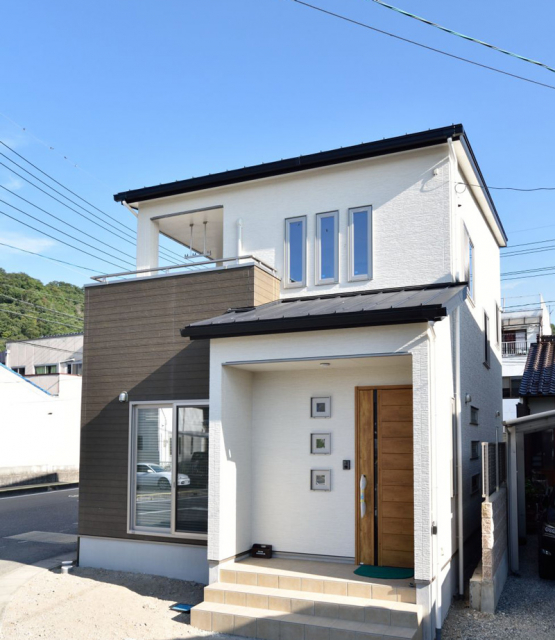 三原市 注文住宅 O様邸中心市街地の区画に対応し、間口幅を最大限に活かした家。空間に余裕のあるキッチンと洗面脱衣室が近く家事にも配慮しています。