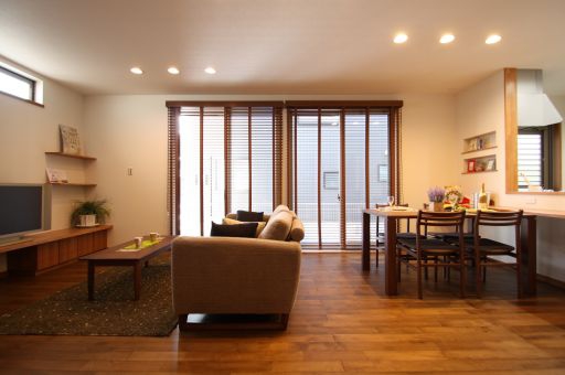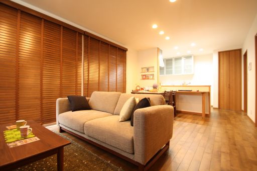 K様邸 新築工事クルミの無垢フローリングは化学物質を含まず、小さなお子様でも安心。10kwの屋根一体型太陽光発電は、地球環境にも家計にも貢献します。
