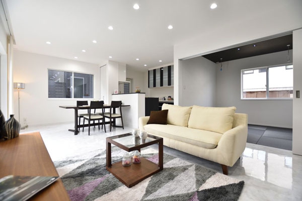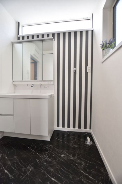 三原市 注文住宅 S様邸白と黒を基調にしたシンプルモダンなデザインに深いブラウンの木目をプラスすることで適度な重みと落ち着きを与えてくれるデザインです。