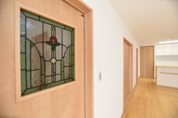 手作りステンドグラスと扉にあしらい、白を基調にしたシンプルデザインの家