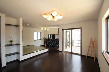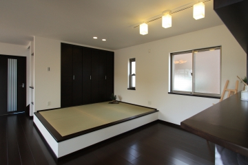 S様邸新築工事タタミとシックなインテリア・壁紙がマッチした、オリジナリティのあふれた光の降り注ぐこだわりの家。