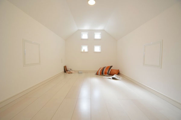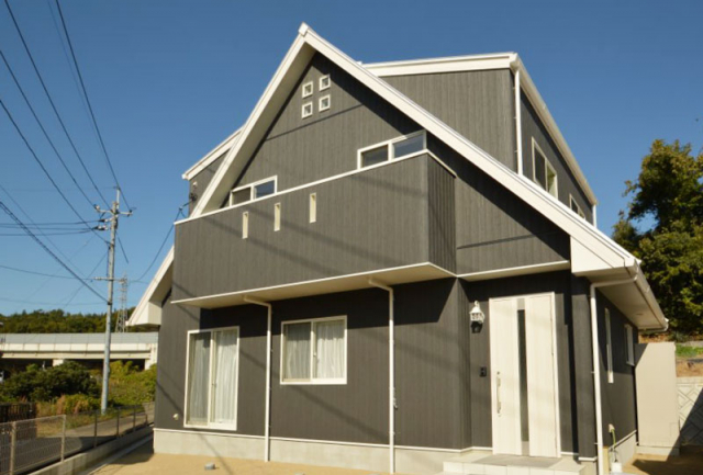 F様邸 新築工事人々の目を惹きつける印象的な外観。収納をたくさんとり、屋根裏の空間も有効利用できたりとコンパクトでありながら機能性を備えた間取り。個性ある快適住宅が完成しました。