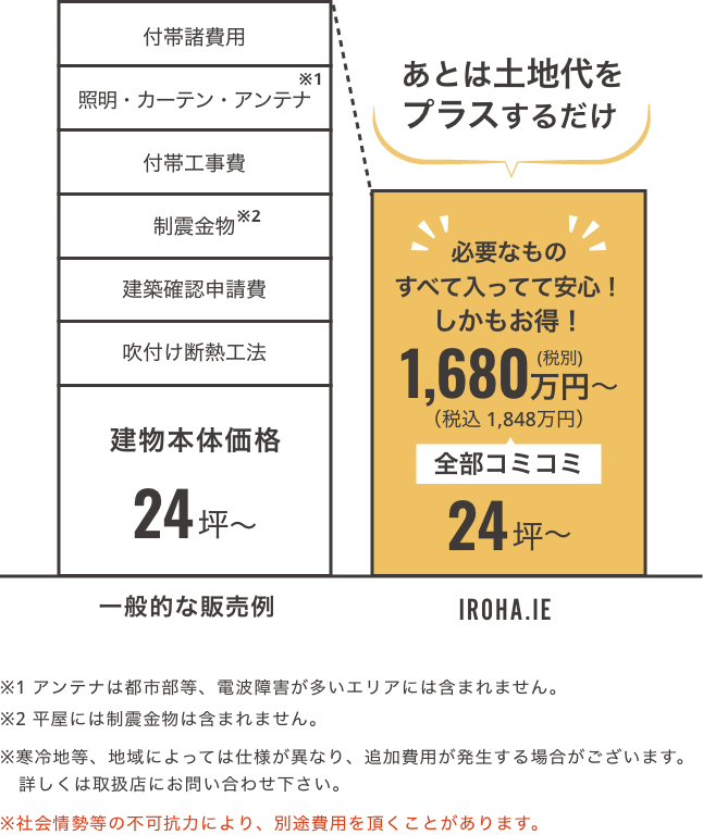 (いろは.いえ)家づくりで不安に思う方が一番多いのがお金のこと。構造や申請にかかわる専門的なお金のことはよくわからないことだらけ。いろいろ選ぶうちにどんどん予算が膨らみ結局どれか諦めないといけない…なんてことも。 「いろは.いえ」なら家づくりに必要なすべてが含まれてワンプライスだから予算オーバーの心配はなく、安心して家づくりができます!