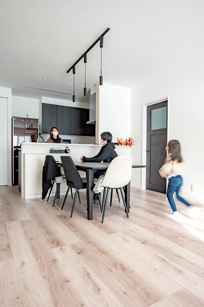 主人がバイクガレージをつくりたいという思いがあったのですが、その代わりリビングを広く取れないかもしれないという葛藤がありました。ですが、設計士の羽田さんがその悩みを解消できるアドバイスを的確にして下さりとても心強かったです。また、雰囲気を大切にしていたので統一感を出すためにクロスの色合いにはとても悩みました。リビングのタタミルームを黒いクロスにしようと考えていたのですが、羽田さんから「子どもたちが過ごすタタミルームで黒いクロスにすると部屋が暗くなってしまうので明るいクロスにするべき」とアドバイスを下さりました。悩んだ末、そのアドバイス通り白いクロスにしたのですが、実際に住んでみて白いクロスにして絶対に正解だったなと今は思います。当時私たちの意見とは反対のアドバイスを言いにくい中でもして下さったことにとても感謝しています。