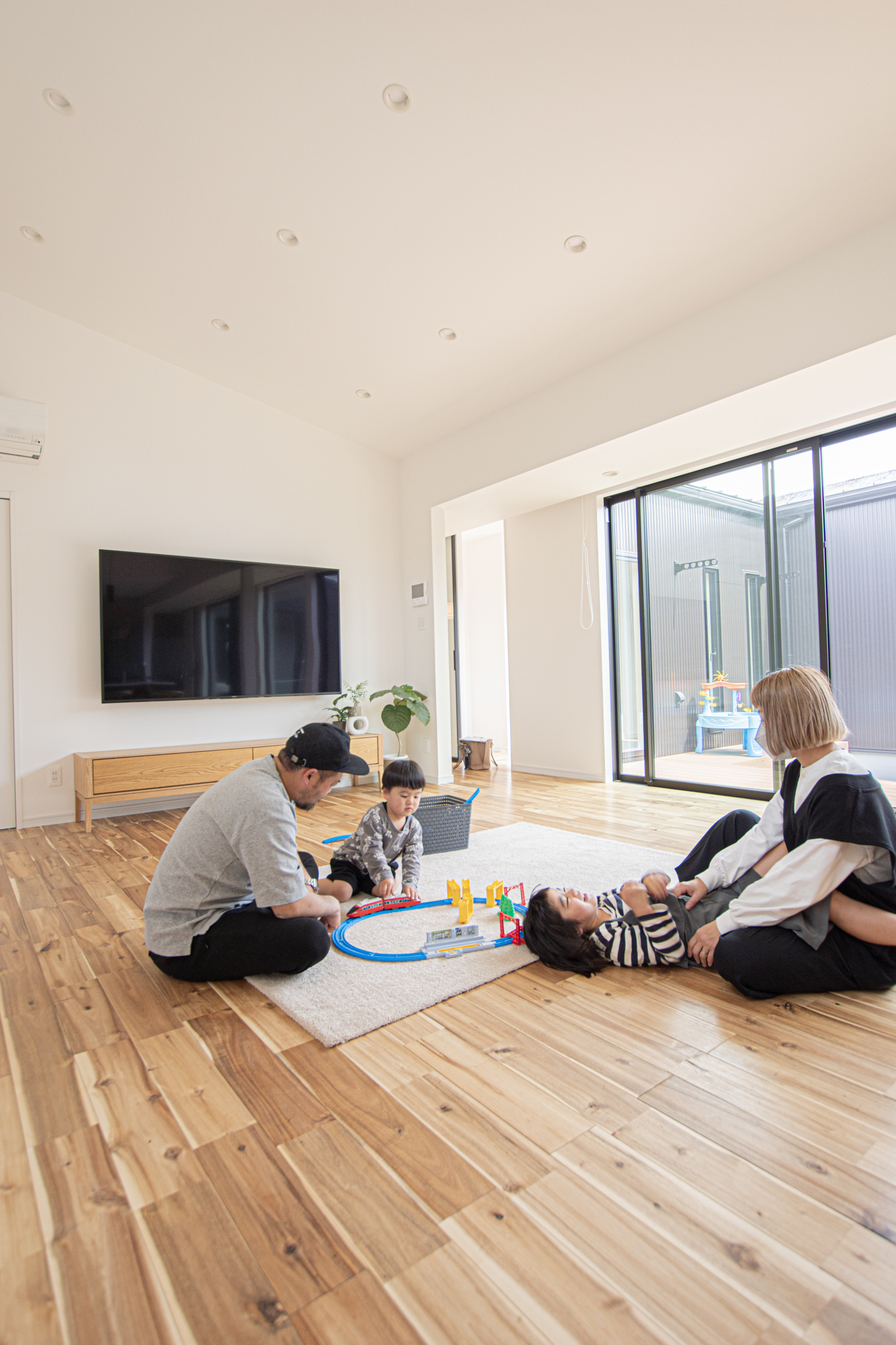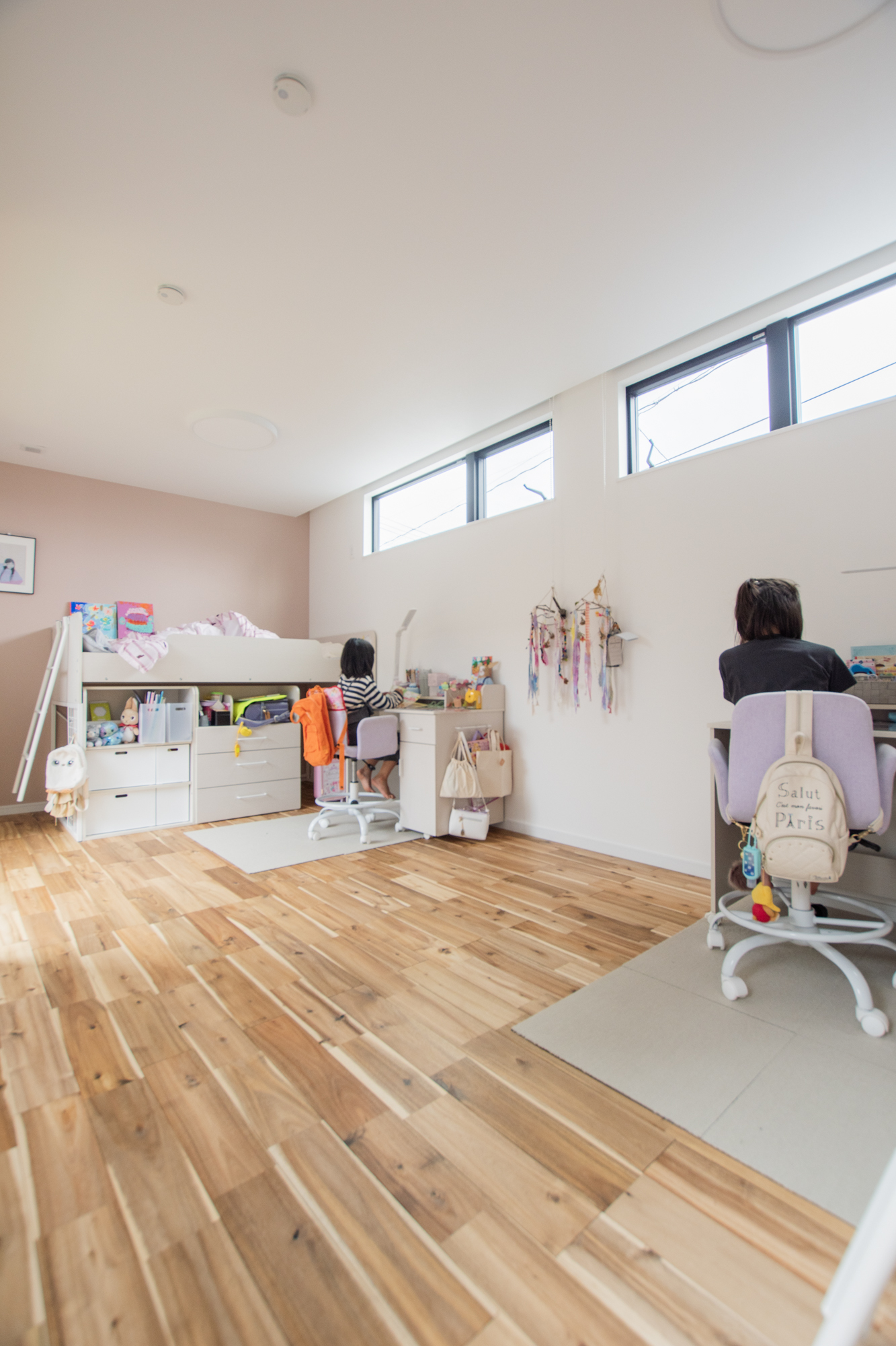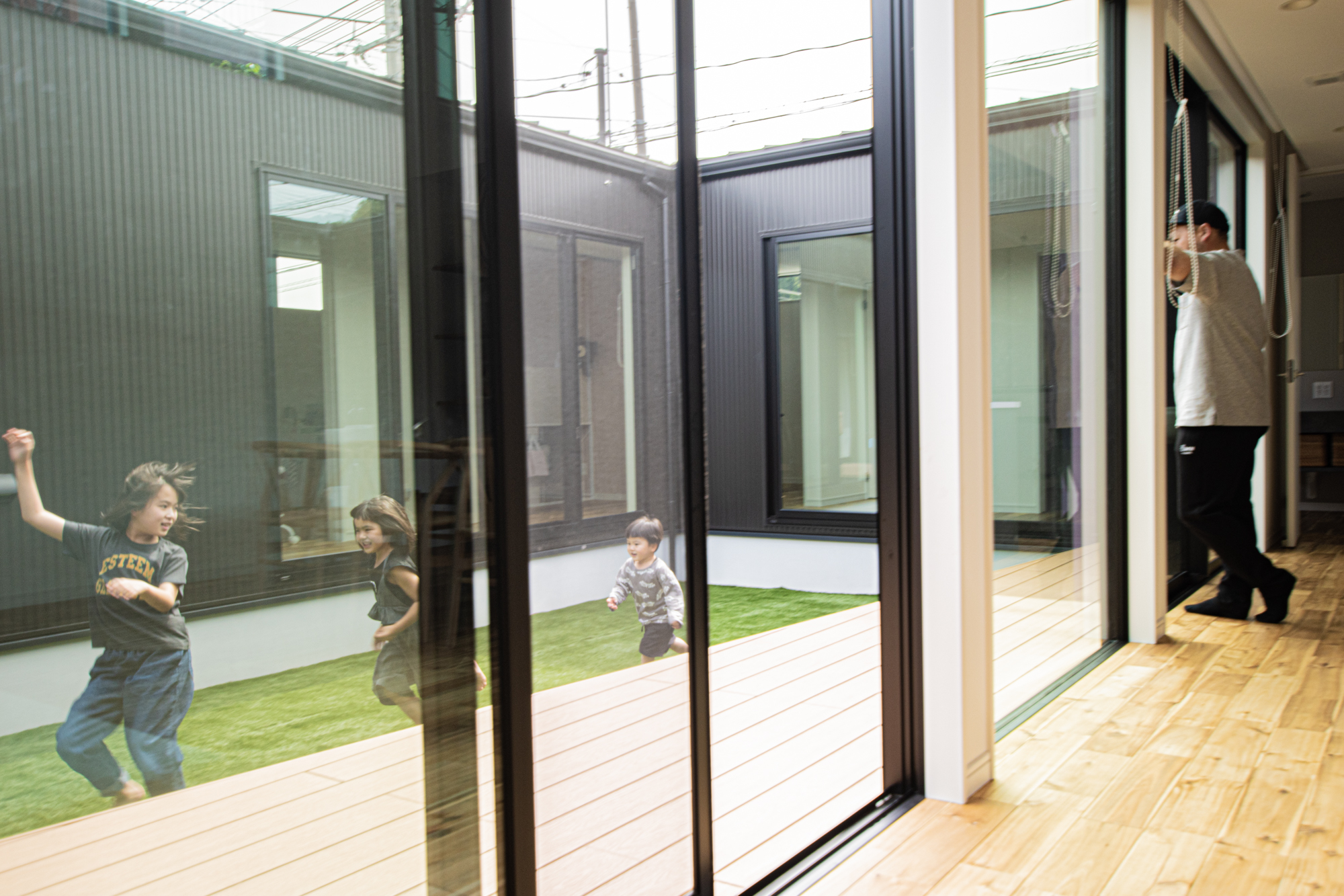 ロの字型の中庭は、プライバシーを守り、子どもたちを家に居ながらたっぷり遊ばせられるだけでなく、室内が昼間は電気をつけなくてもとても明るいです。全面に大きな窓を付けているのでリビングから子ども部屋など違う部屋の様子も見る事が出来るので子育てにも安心の間取りになっています。ランドリールームとファミリークローゼットを繋げた動線、靴を並べられる広いシューズクローゼット、子ども部屋は長女と次女の部屋を今は1つの空間にしていますが、真ん中に仕切りを付けれるようにし、将来子供たちが成長しても安心の部屋になりました。すべてにこだわったので、挙げるとキリがありません!(笑)