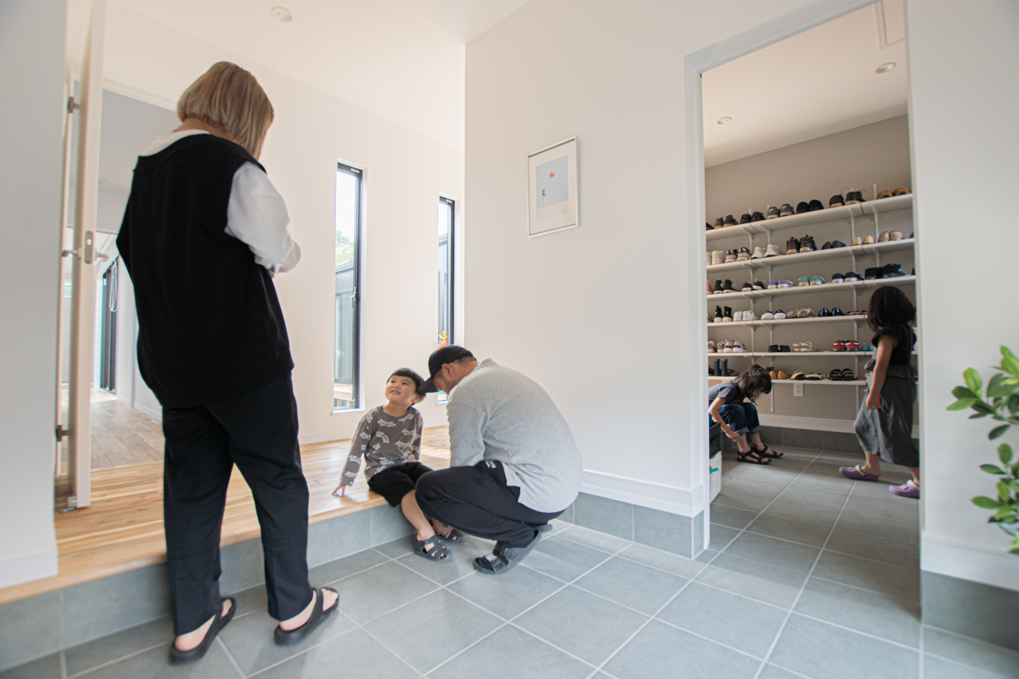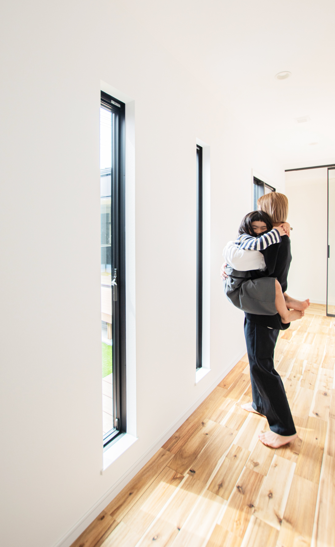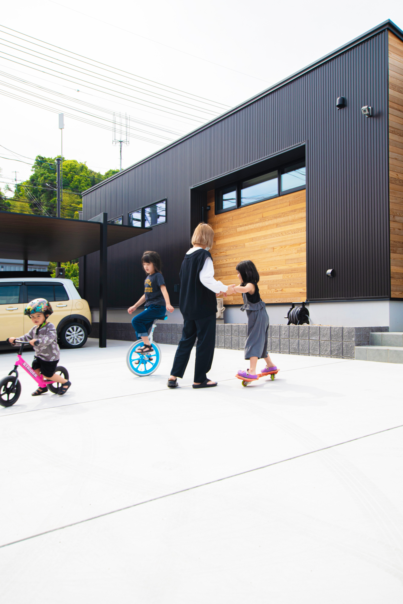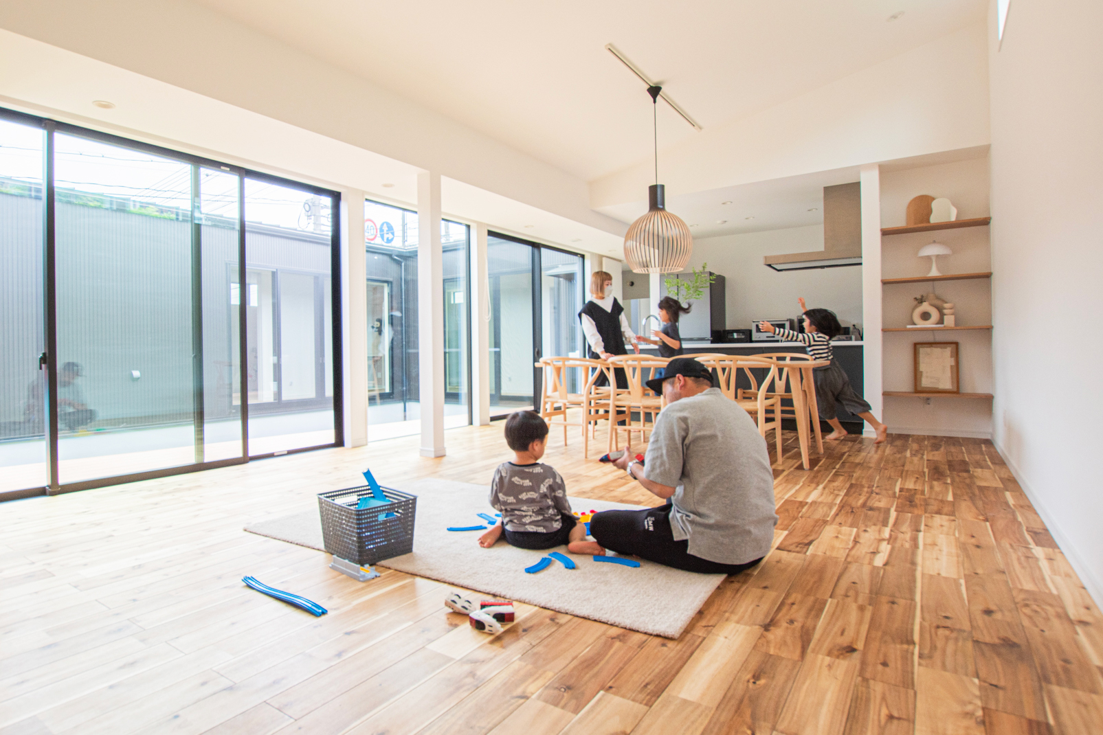 ロの字型の中庭は、プライバシーを守り、子どもたちを家に居ながらたっぷり遊ばせられるだけでなく、室内が昼間は電気をつけなくてもとても明るいです。全面に大きな窓を付けているのでリビングから子ども部屋など違う部屋の様子も見る事が出来るので子育てにも安心の間取りになっています。ランドリールームとファミリークローゼットを繋げた動線、靴を並べられる広いシューズクローゼット、子ども部屋は長女と次女の部屋を今は1つの空間にしていますが、真ん中に仕切りを付けれるようにし、将来子供たちが成長しても安心の部屋になりました。すべてにこだわったので、挙げるとキリがありません!(笑)