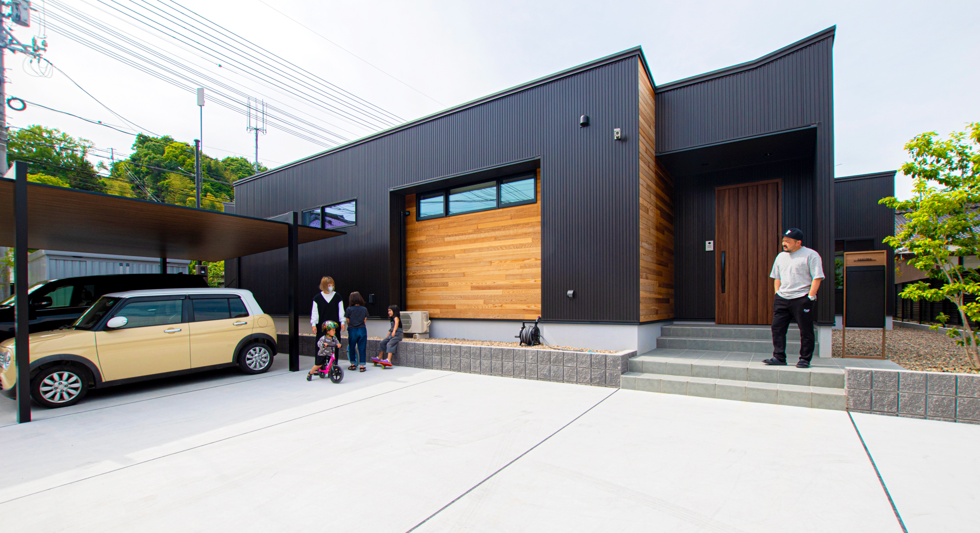 ガリバリウムと木目の外観が目を引く、中庭のあるモダンな平屋のS様邸の家づくりをご紹介します。