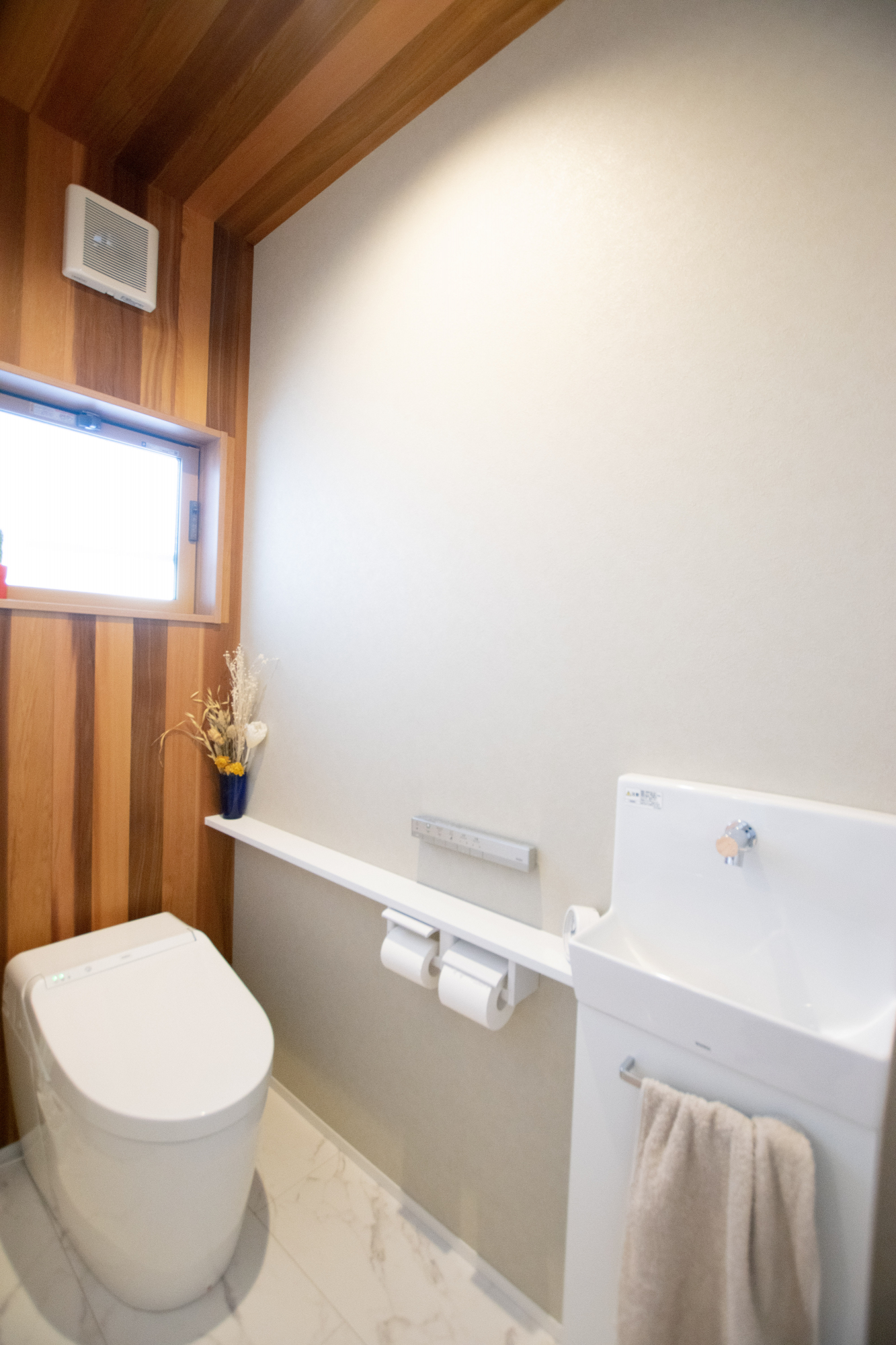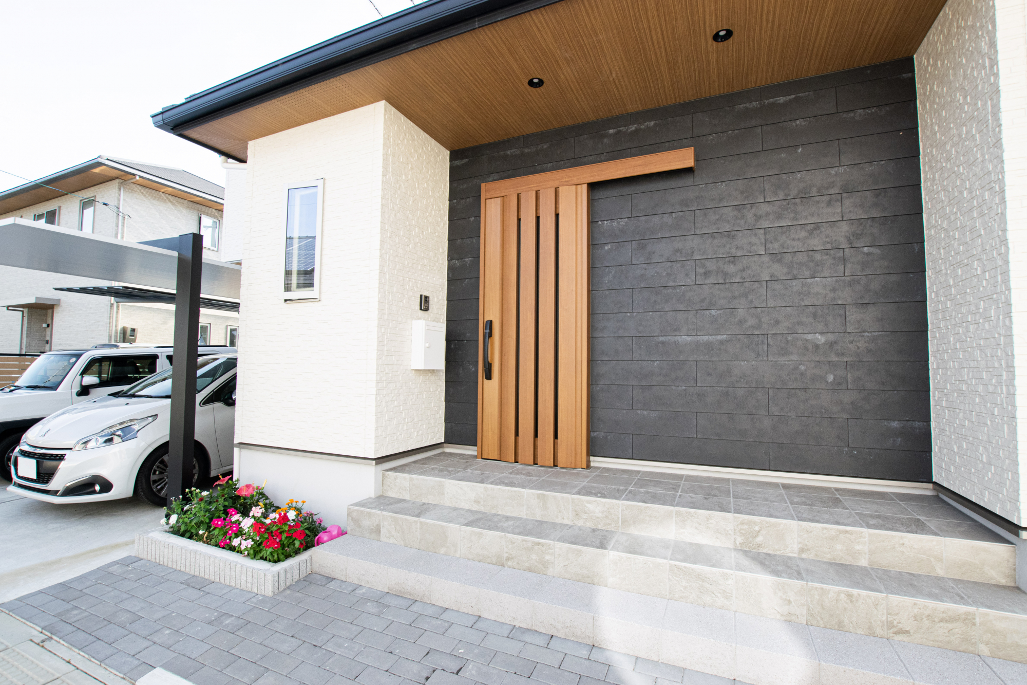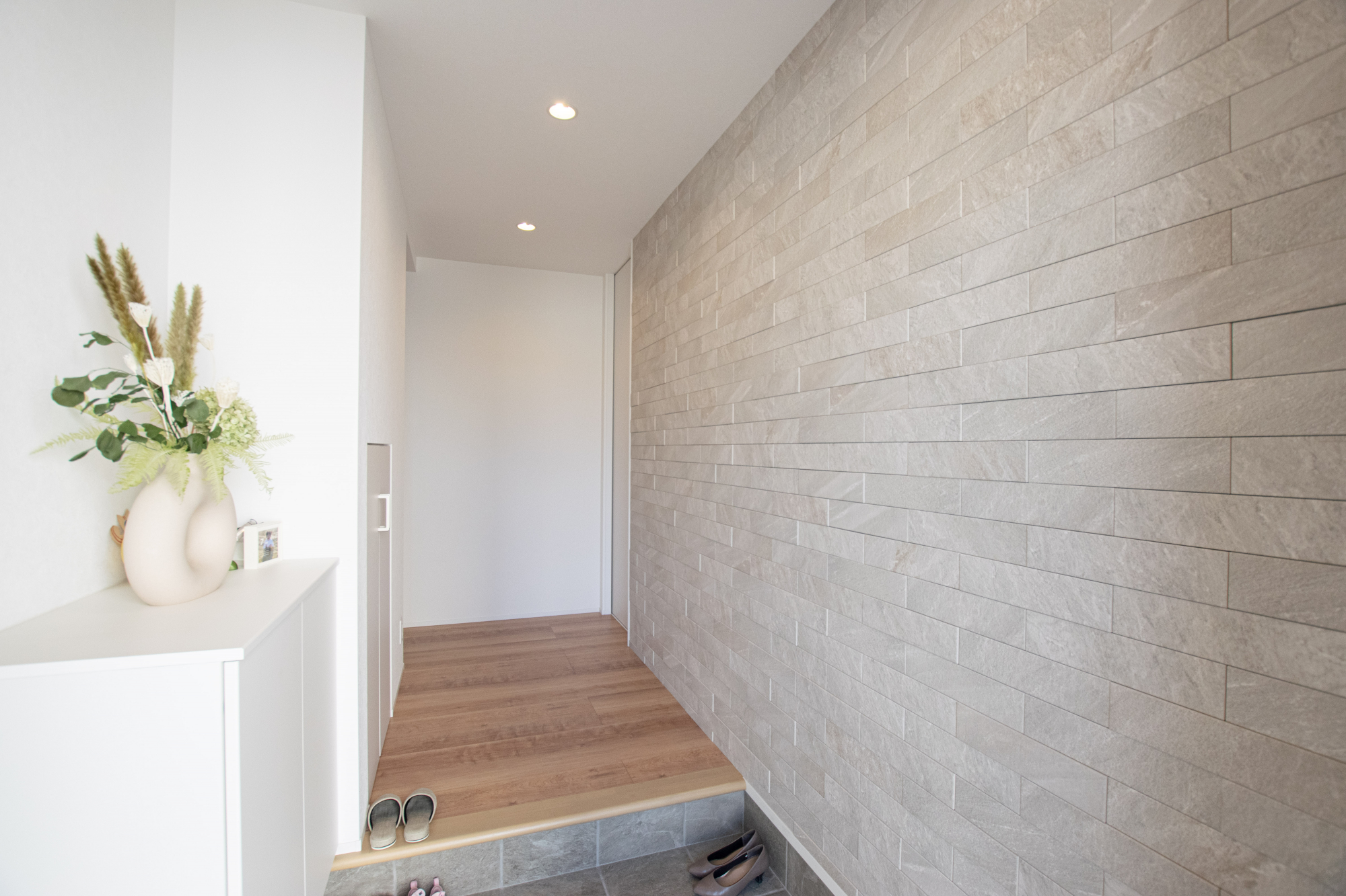 リビングを広く感じさせる工夫としてすべてのドアをハイドアにしたり、横並びで使える広い洗面室など、デザインと暮らしやすさを両立させる工夫をし、おうち全体の雰囲気から動線、収納量や設備など細部までこだわっています。また、質感や素材にこだわりを持ち、キッチンの下がり天井やトイレにクロスではなく本物の木を取り入れたり、玄関ポーチや玄関ホールにこだわり素材のタイルを使用したりとシンプルなだけではない上質な雰囲気を叶えました。