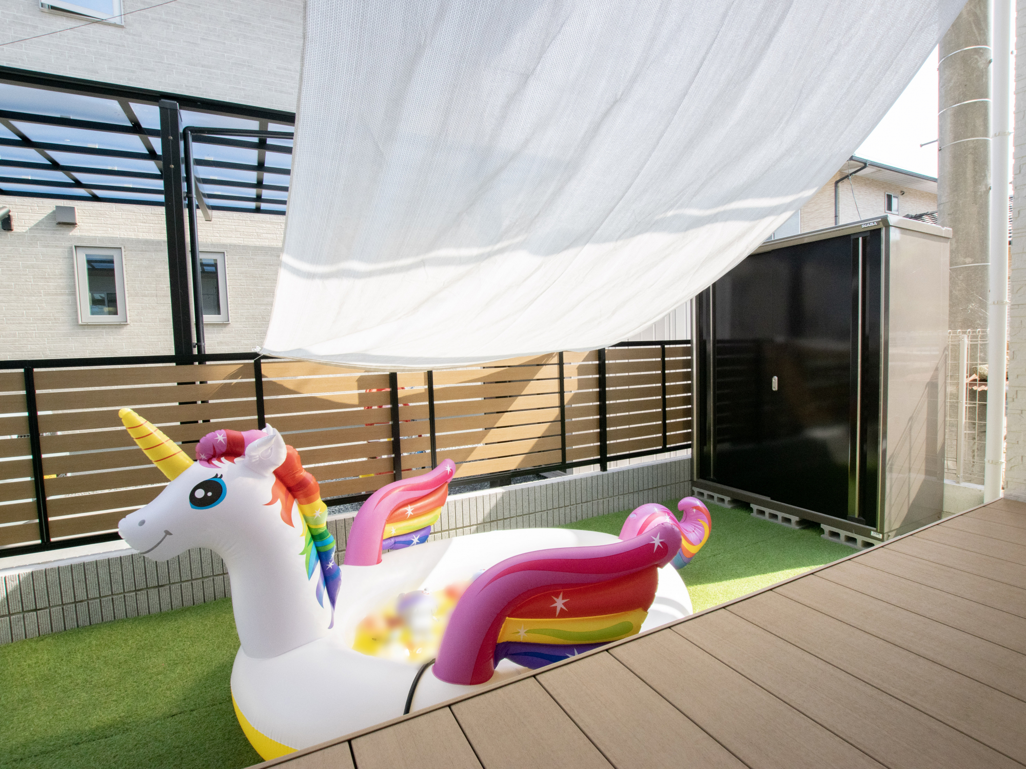 広いリビングが理想ですが、そうなるとどうしても庭が広く取れなくなってしまうのでそのバランスを決断する事には悩みました。ですが、リビングを広くとり、庭に倉庫を置いてもプール遊びが余裕で出来る広い庭がつくれる間取りを提案して頂き、理想を叶えることができました。また、ネットで家を調べていると色々取り入れたくなってしまい、打ち合わせの度に新しい要望を聞いてもらっていました。それでもしっかりと受け入れて下さり、まずは設備から決めていき、残った予算の中で出来る限り理想のデザインや間取りを叶えた提案をしてくださいました。