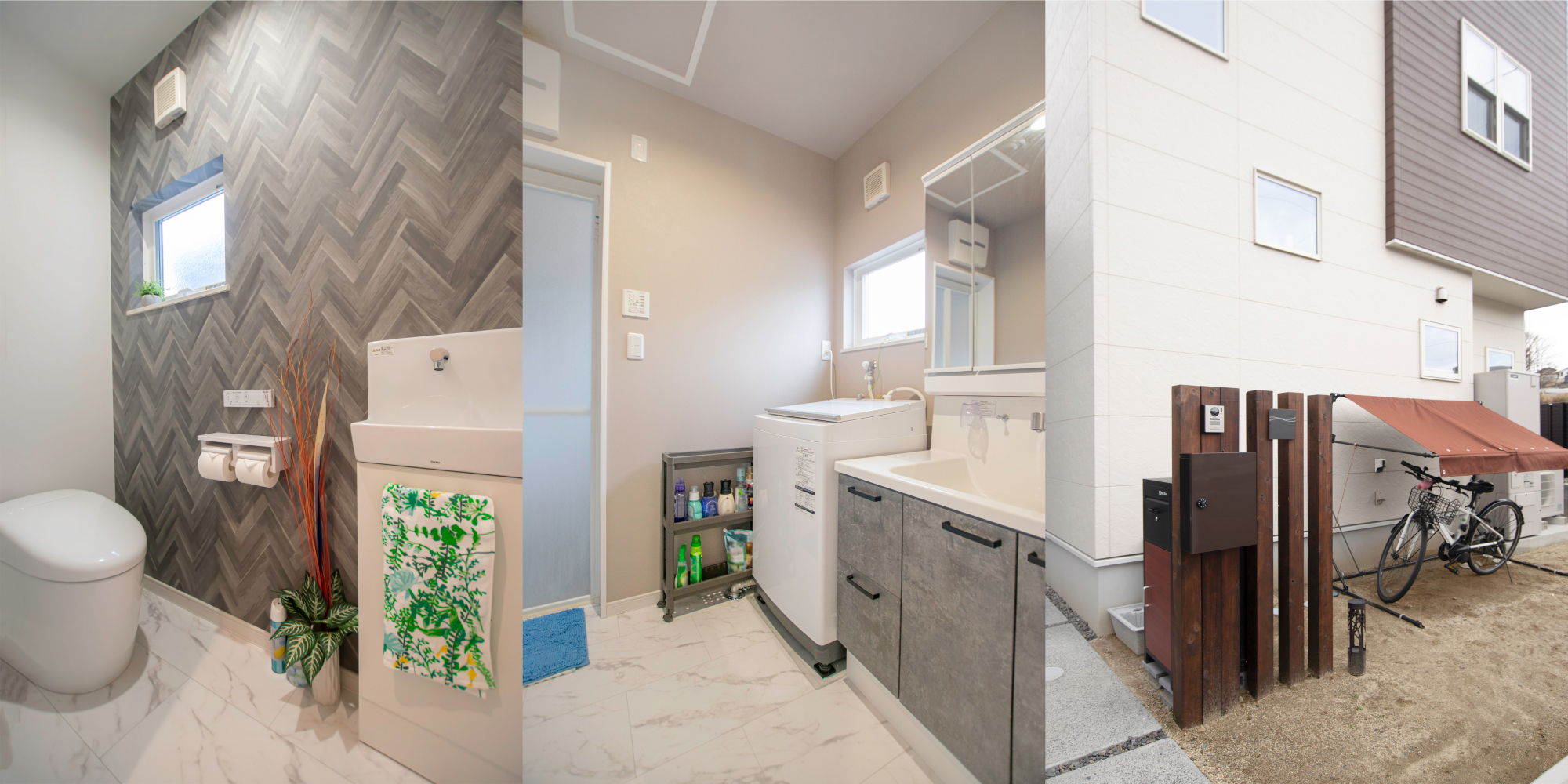 洗面室とお風呂は元々白基調だったのですが、お風呂の床の色と洗面室の床の色を暖色系グレーに合わせて変更し、落ち着いた上品な雰囲気が好きです。