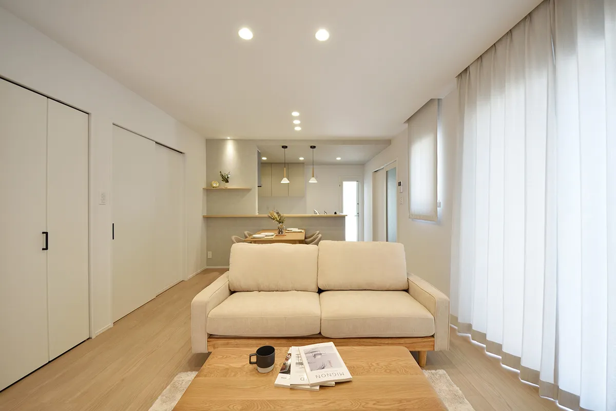 やわらかな木目と柔らかな光が調和した、ナチュラルモダンなリビングダイニング。自然と会話が生まれる、家族が心地よく過ごせる空間です。